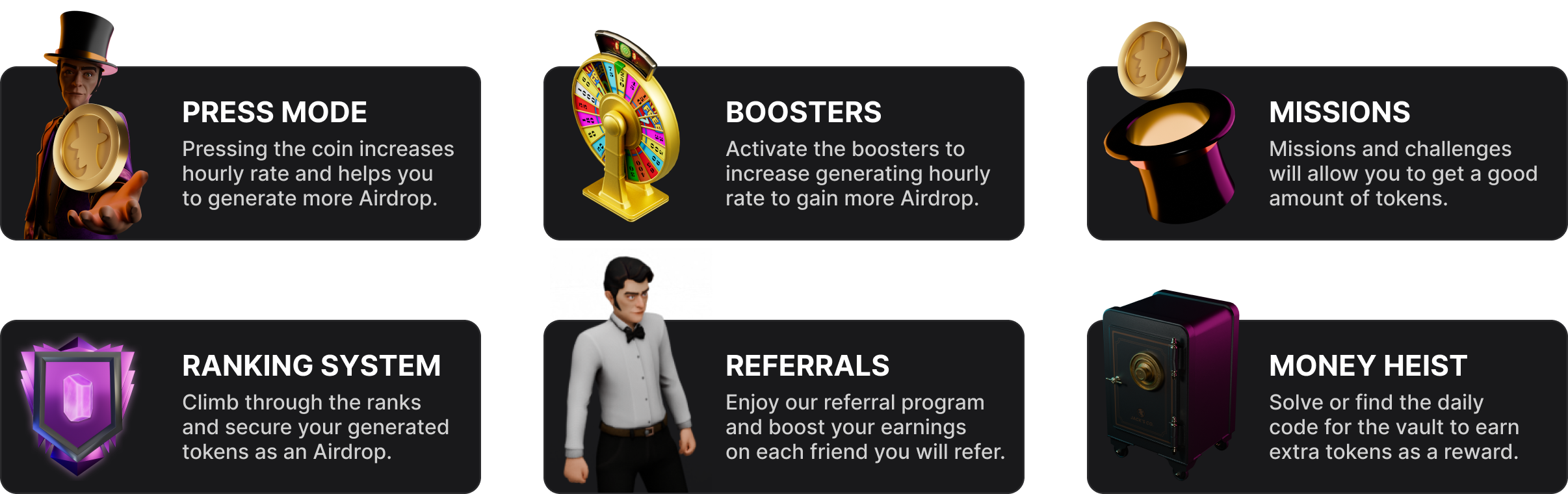 Participants generate $JACK tokens through various Tasks and Daily Challenges. They can earn and accumulate tokens by completing these activities and progressing through the ranks. Activating boosters further enhances their earning potential, increasing the hourly rate of token generation.&#x20;